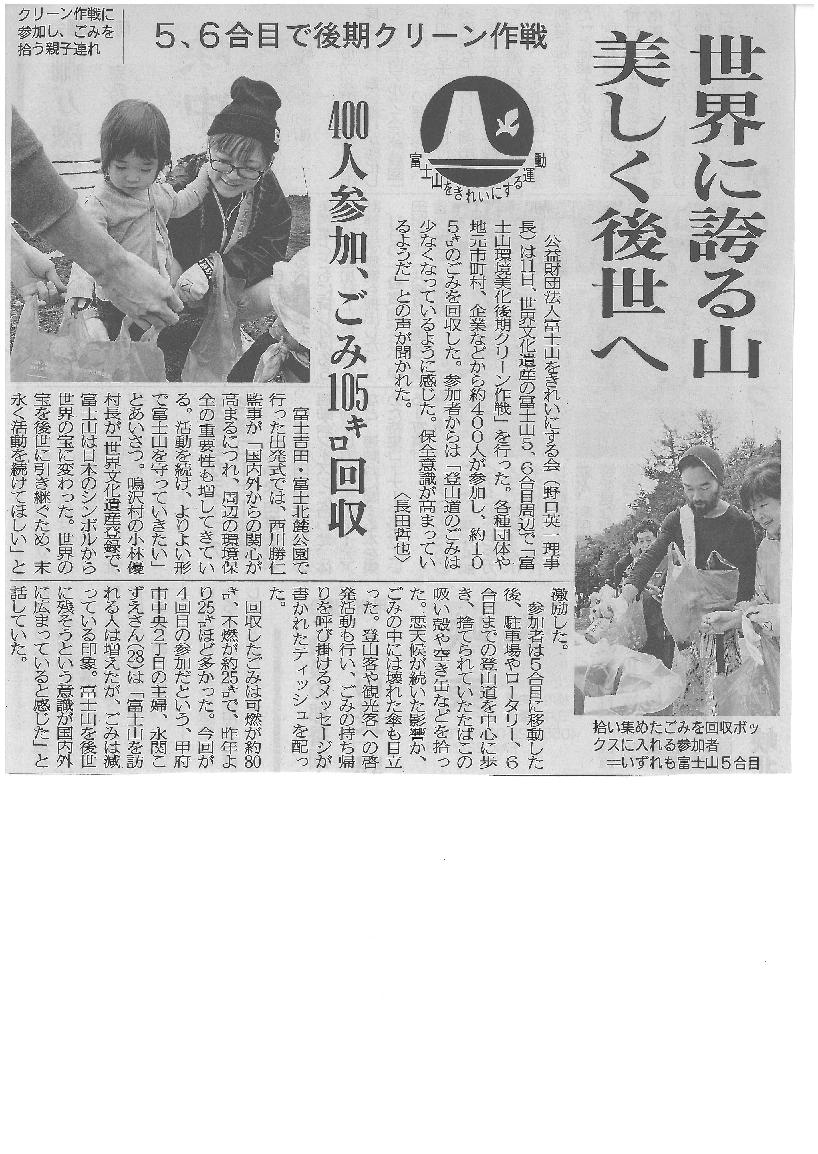 世界に誇る山 美しく後世へ2015年9月14日 山梨日日新聞平成27年9月12日 公益財団法人富士山をきれいにする会は11日、世界文化遺産の富士山5、6号目周辺で「富士山環境美化後期クリーン作戦」を行った。 英語パンフで富士山紹介 御殿場の研究会 世界に誇る山 美しく後世へ 富士山麓 歩いてきれいに