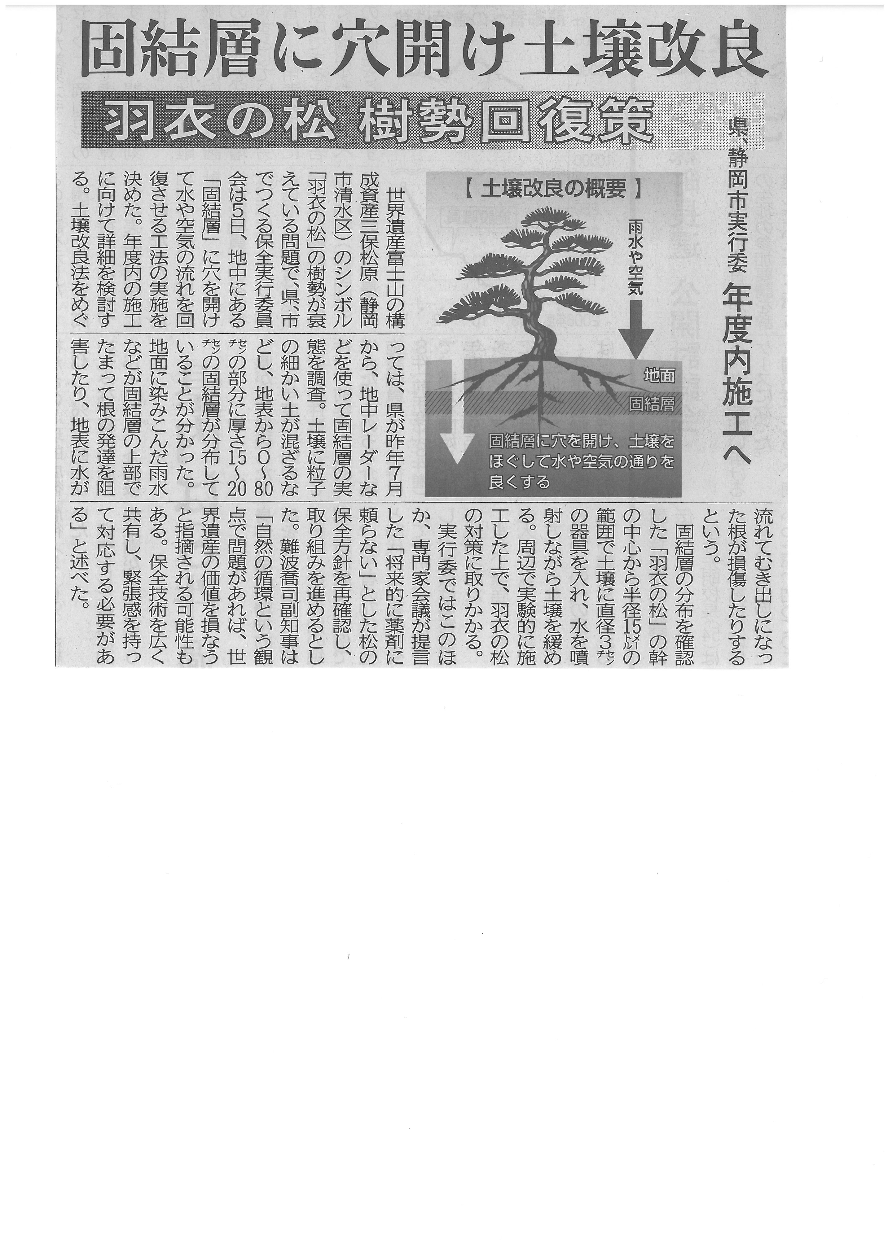固結層に穴開け土壌改良 「羽衣の松」樹勢回復策決定2016年2月8日 静岡新聞 平成28年2月6日 朝刊 [富士山保全報告書 提出] 登山者抑える具体策 早急に 固結層に穴開け土壌改良 「羽衣の松」樹勢回復策決定 千円札の富士 安全登山で堪能を