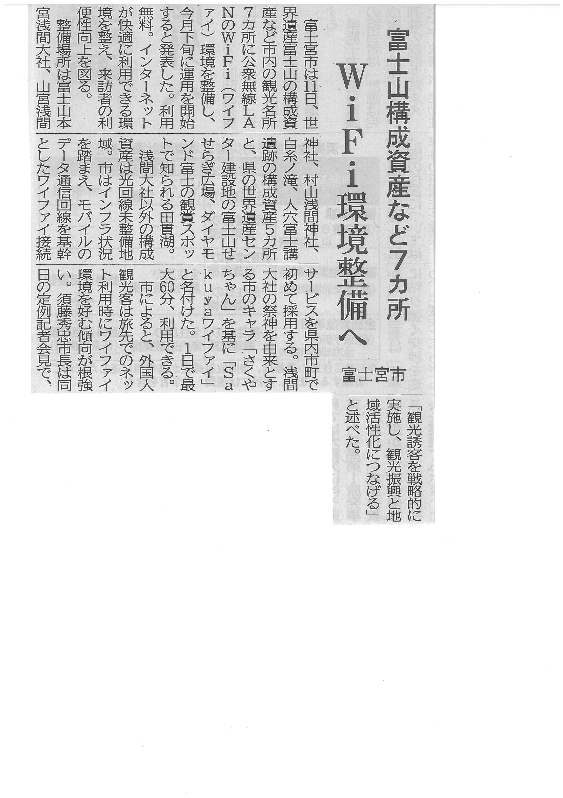 富士宮市、WiFi環境整備へ 富士山構成資産など7カ所2016年3月14日 静岡新聞 平成28年3月12日 朝刊 富士山景観配慮県条例6月施行 山梨県 富士宮市、WiFi環境整備へ 富士山構成資産など7カ所 富士山入山料で 有識者専門委開かれる