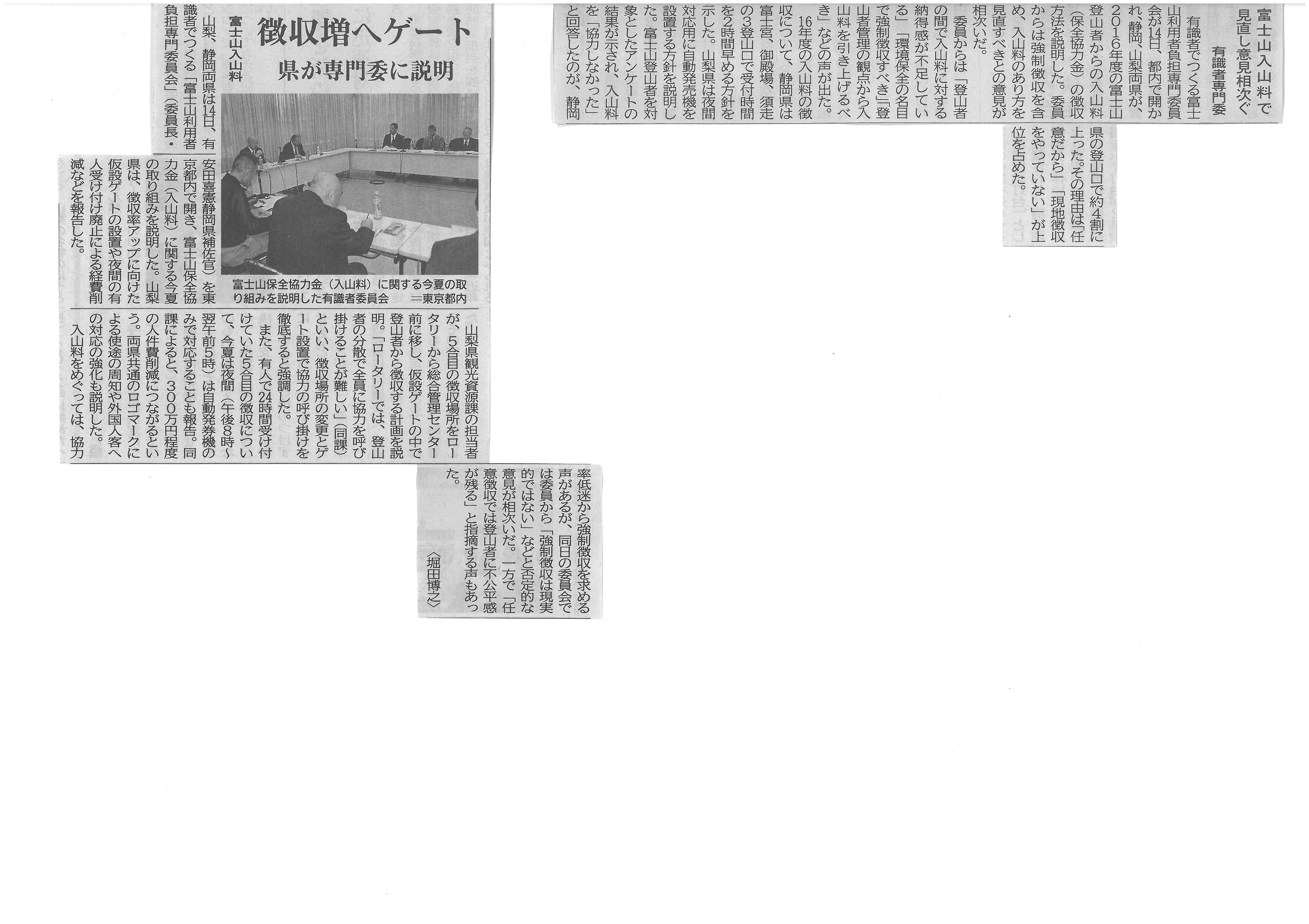 富士山入山料で 有識者専門委開かれる2016年3月15日 山梨日日新聞 平成28年3月15日 静岡新聞 平成28年3月15日 朝刊 富士宮市、WiFi環境整備へ 富士山構成資産など7カ所 富士山入山料で 有識者専門委開かれる 富士山噴火6パターン想定 避難地図、年度内完成・周知へ