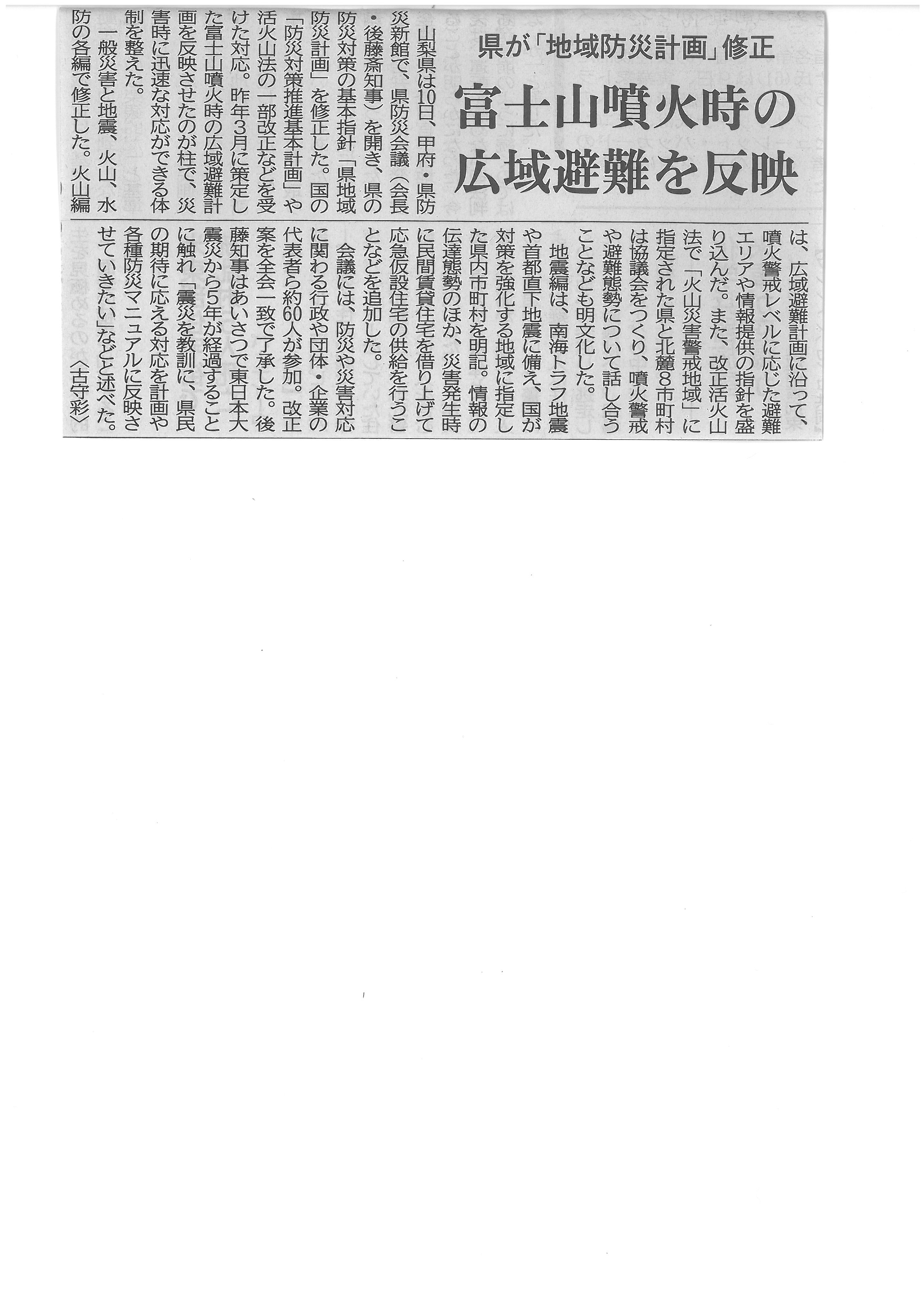 富士山噴火時の広域避難を反映 山梨県が「地域防災計画」修正2016年3月11日 山梨日日新聞 平成28年3月11日 富士山入山料 協力率向上へ「ゲート」 富士山噴火時の広域避難を反映 山梨県が「地域防災計画」修正 富士山景観配慮県条例6月施行 山梨県