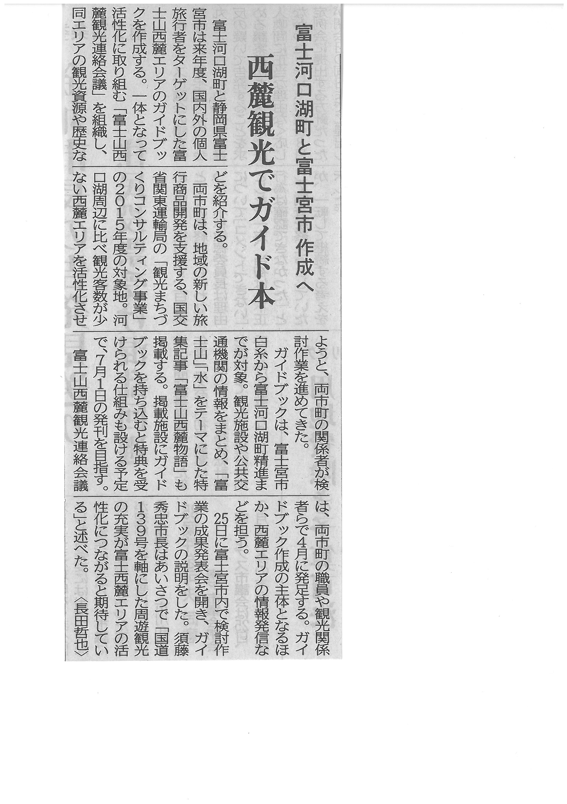 富士山西麓観光でガイド本 富士河口湖町と富士宮市 作成へ2016年3月28日 山梨日日新聞 平成28年3月26日 集客施設の噴火避難計画 政府が手引公表 富士山周辺など 富士山西麓観光でガイド本 富士河口湖町と富士宮市 作成へ 須走口マイカー規制、63日間 富士山の開山全期間