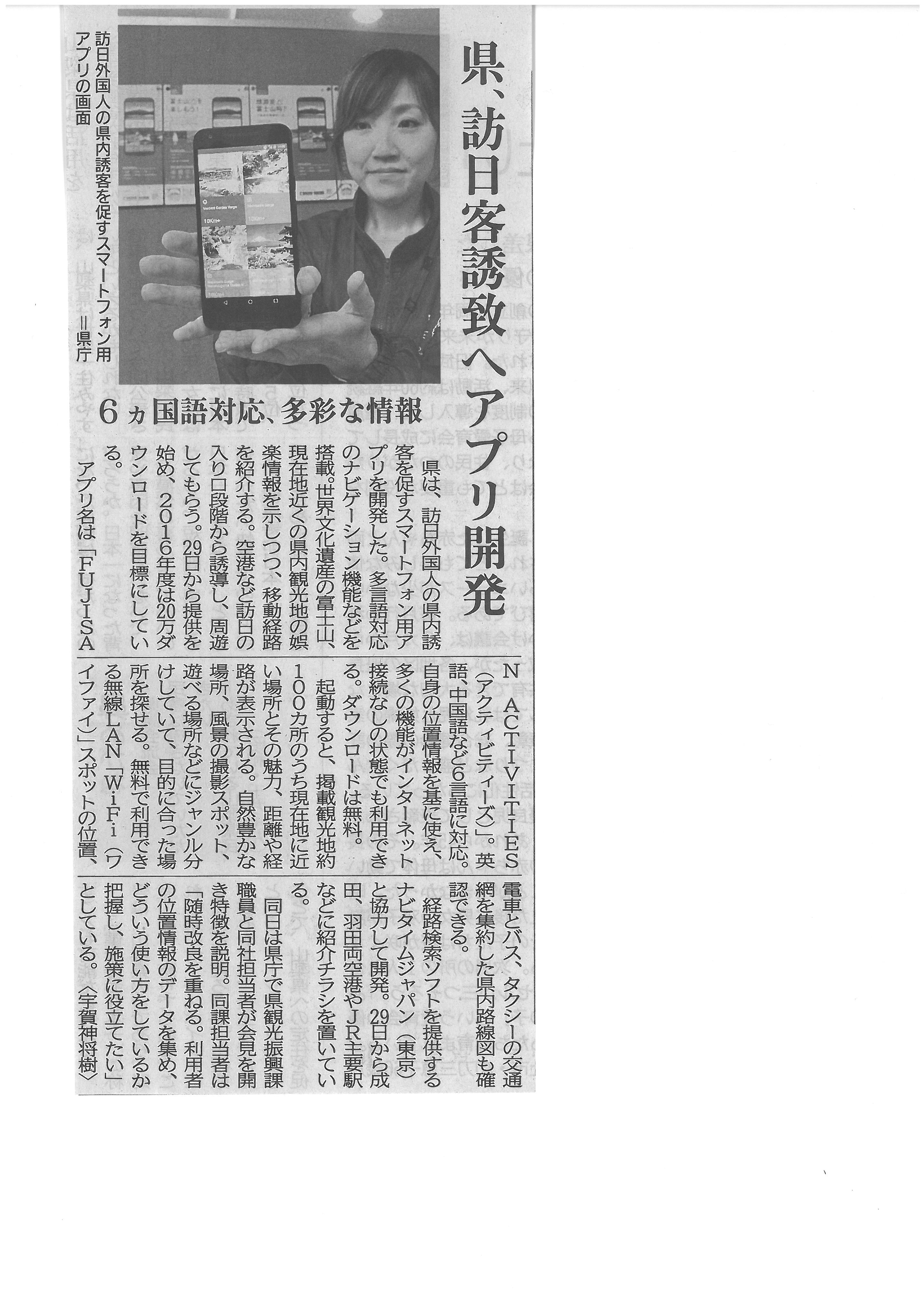 山梨県、訪日客誘致へアプリ開発2016年3月30日 山梨日日新聞 平成28年3月30日 須走口マイカー規制、63日間 富士山の開山全期間 山梨県、訪日客誘致へアプリ開発 世界遺産で地域振興を 10月、山梨県内でサミット
