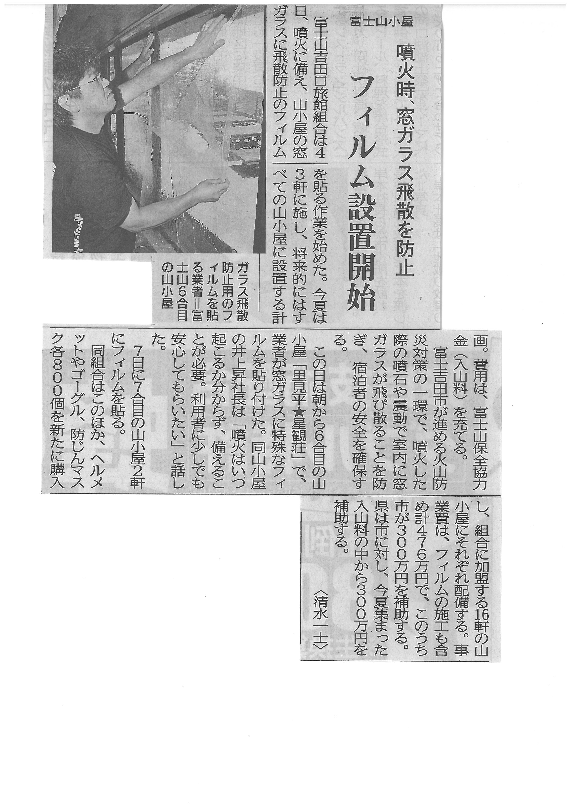 噴火時、窓ガラス飛散を防止 富士山小屋2016年7月5日 山梨日日新聞 平成28年7月5日 富士山山開き 入山料7~8割が協力 噴火時、窓ガラス飛散を防止 富士山小屋 発車早まり午後8時に 富士山シャトルバス最終便