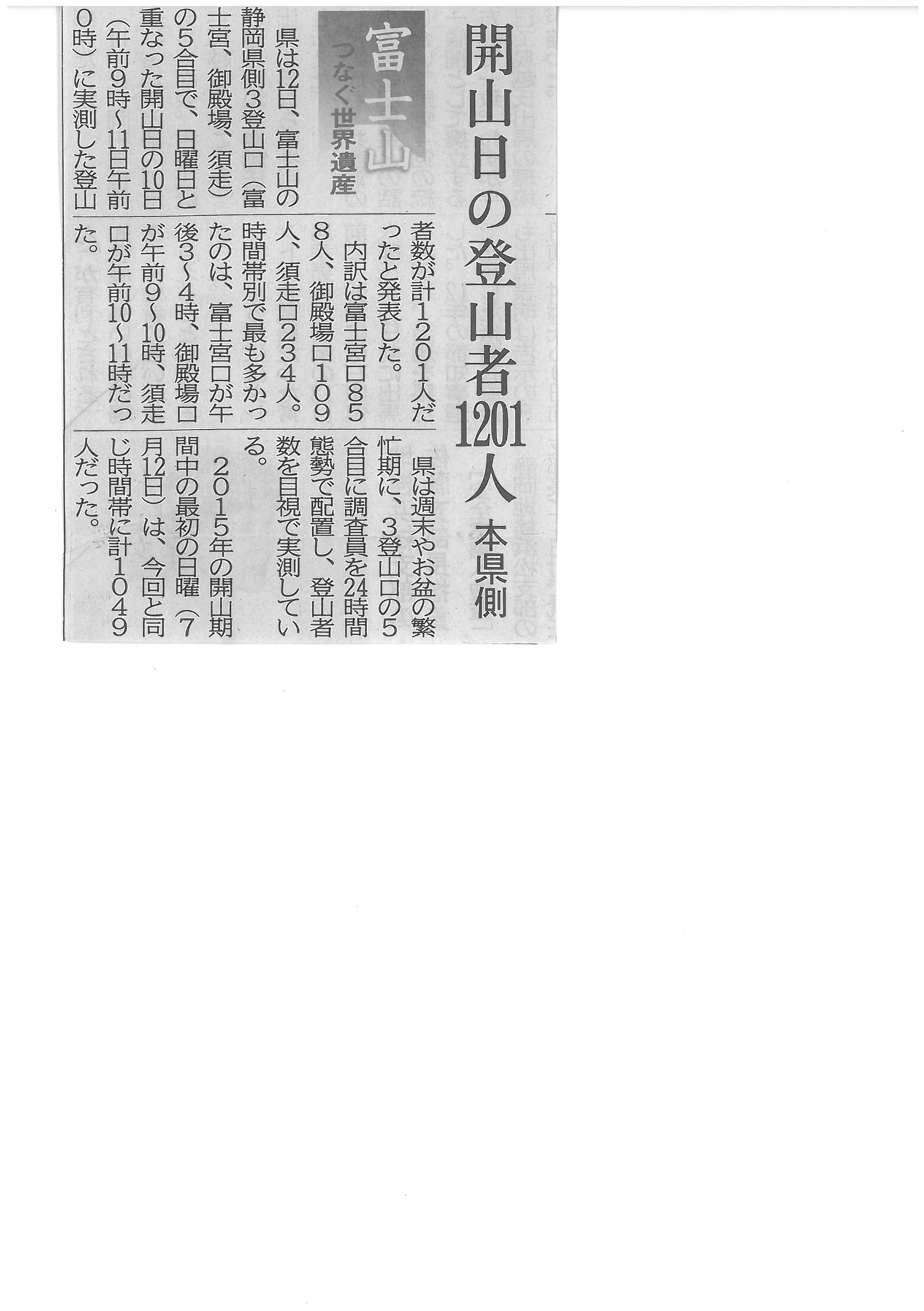 富士山 開山日の静岡県側登山者1201人2016年7月14日 静岡新聞 平成28年7月13日 朝刊 GPSで登山者たどる 富士山 富士山 開山日の静岡県側登山者1201人 富士山の入山料協力 前年の1.9倍