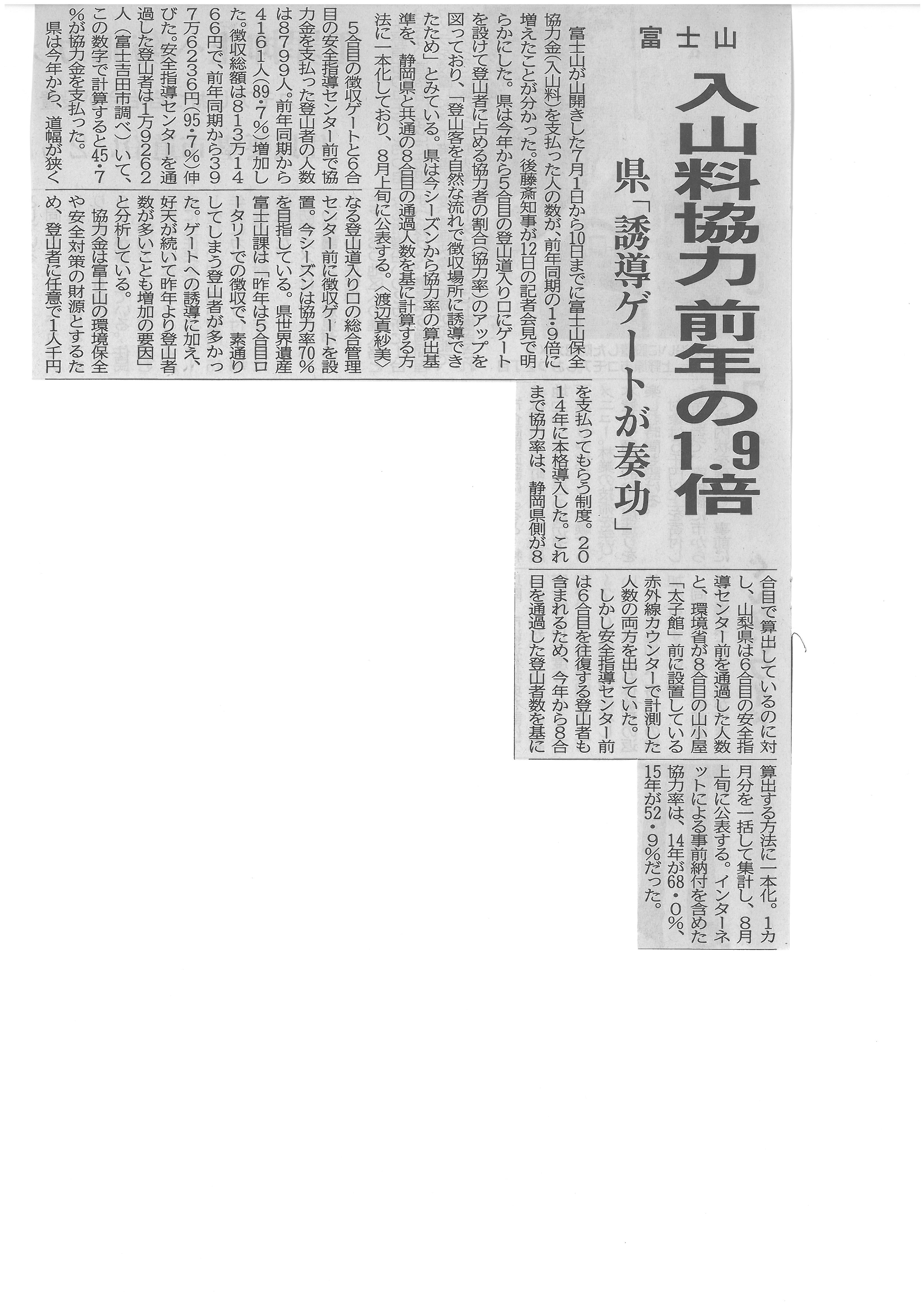 富士山の入山料協力 前年の1.9倍2016年7月14日 山梨日日新聞 平成28年7月13日 富士山 開山日の静岡県側登山者1201人 富士山の入山料協力 前年の1.9倍 富士山の環境 保全アピール VF甲府試合会場で