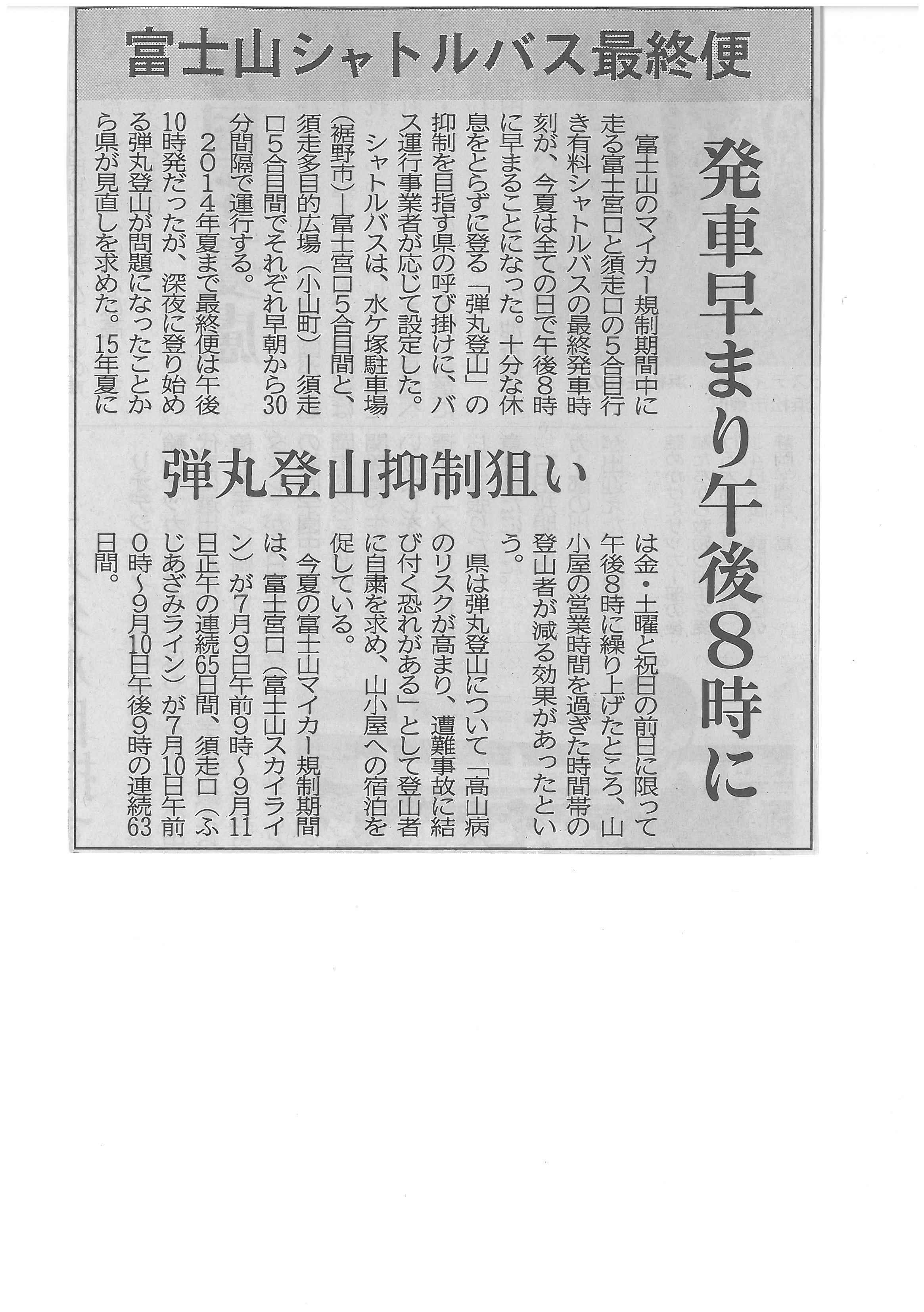 発車早まり午後8時に 富士山シャトルバス最終便2016年7月5日 静岡新聞 平成28年7月5日 朝刊 噴火時、窓ガラス飛散を防止 富士山小屋 発車早まり午後8時に 富士山シャトルバス最終便 マイカー規制、EVとFCV外す 富士山須走口への県道