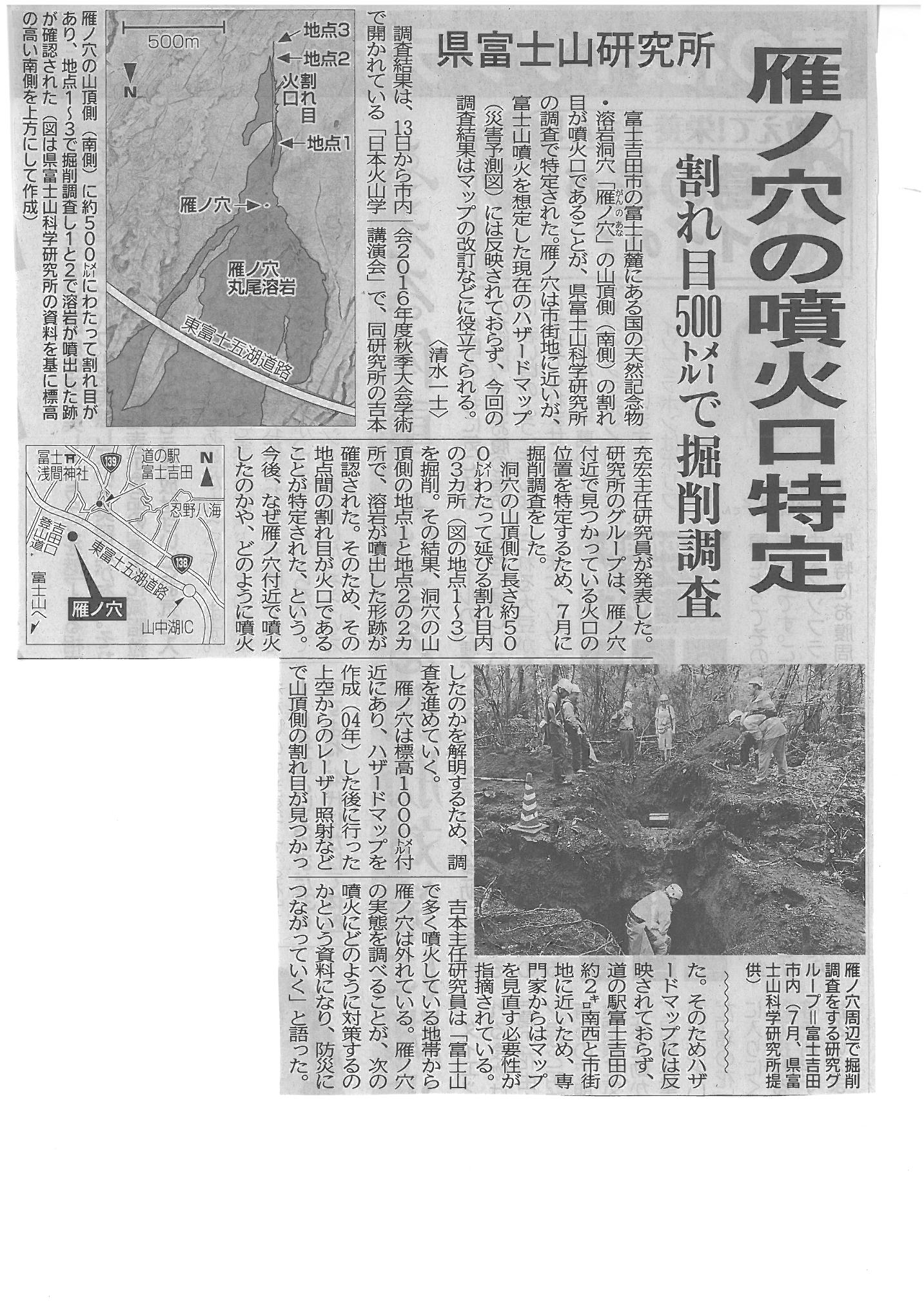 山梨県富士山研究所 雁の穴の噴火口特定2016年10月14日 山梨日日新聞 平成28年10月14日 富士山「初冠雪」いつ? 山梨県富士山研究所 雁の穴の噴火口特定 三保松原ビジターセンター 開館半年遅れに