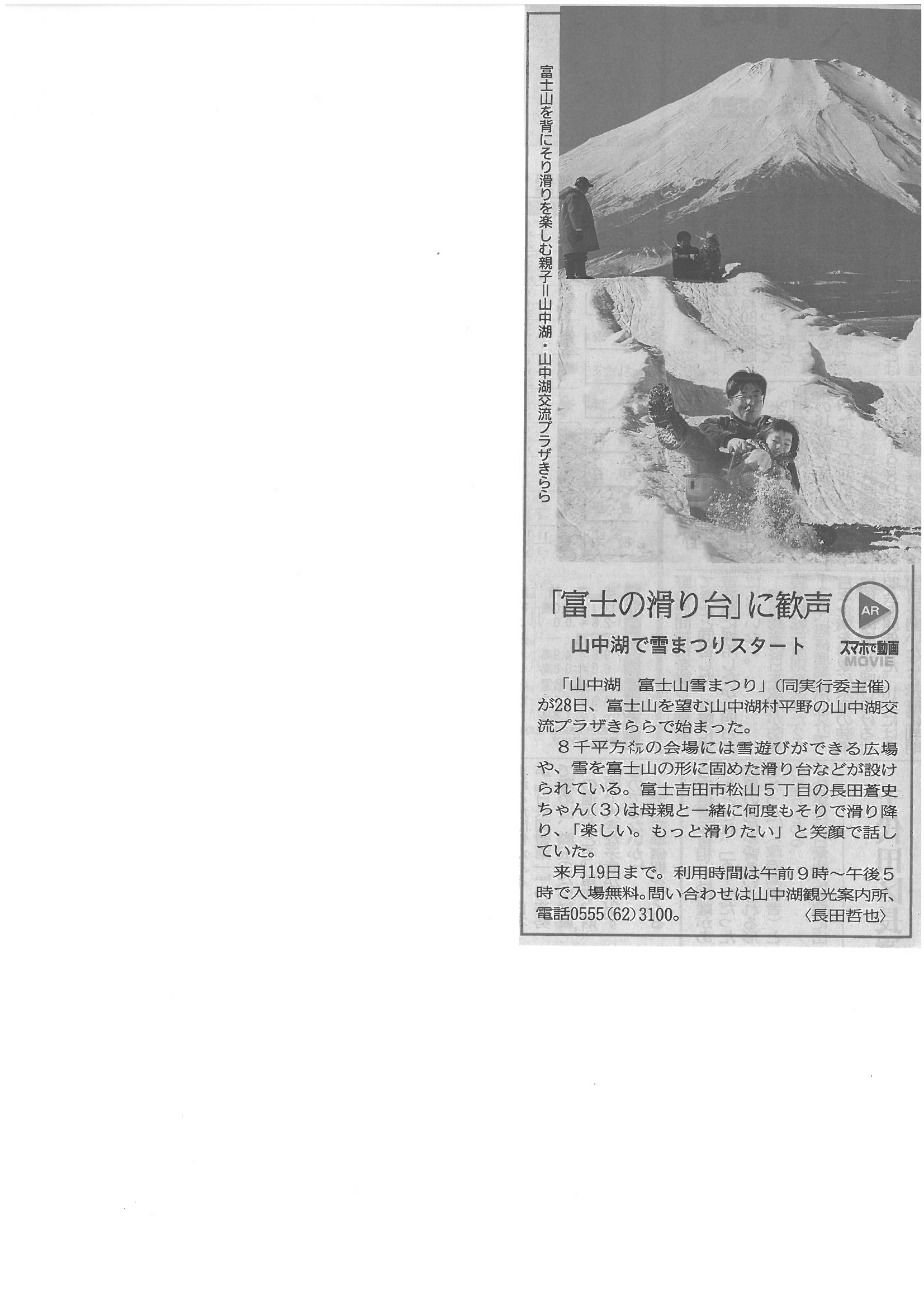 「富士の滑り台」に歓声 山中湖で雪まつりスタート2017年1月30日 山梨日日新聞 平成29年1月29日 富士山信仰が縁結ぶ 「富士の滑り台」に歓声 山中湖で雪まつりスタート 春節にぎわいに陰り?県内観光地客足いまひとつ