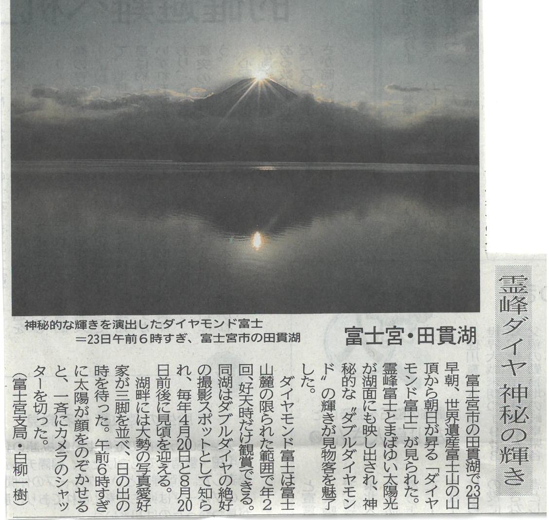 富士宮・田貫湖 霊峰ダイヤ神秘の輝き2017年4月25日 静岡新聞 平成29年4月24日(月)朝刊 山梨県民生活部長に就任した 立川弘行さん 富士宮・田貫湖 霊峰ダイヤ神秘の輝き 「誉富士」の地酒 富士山で熟成