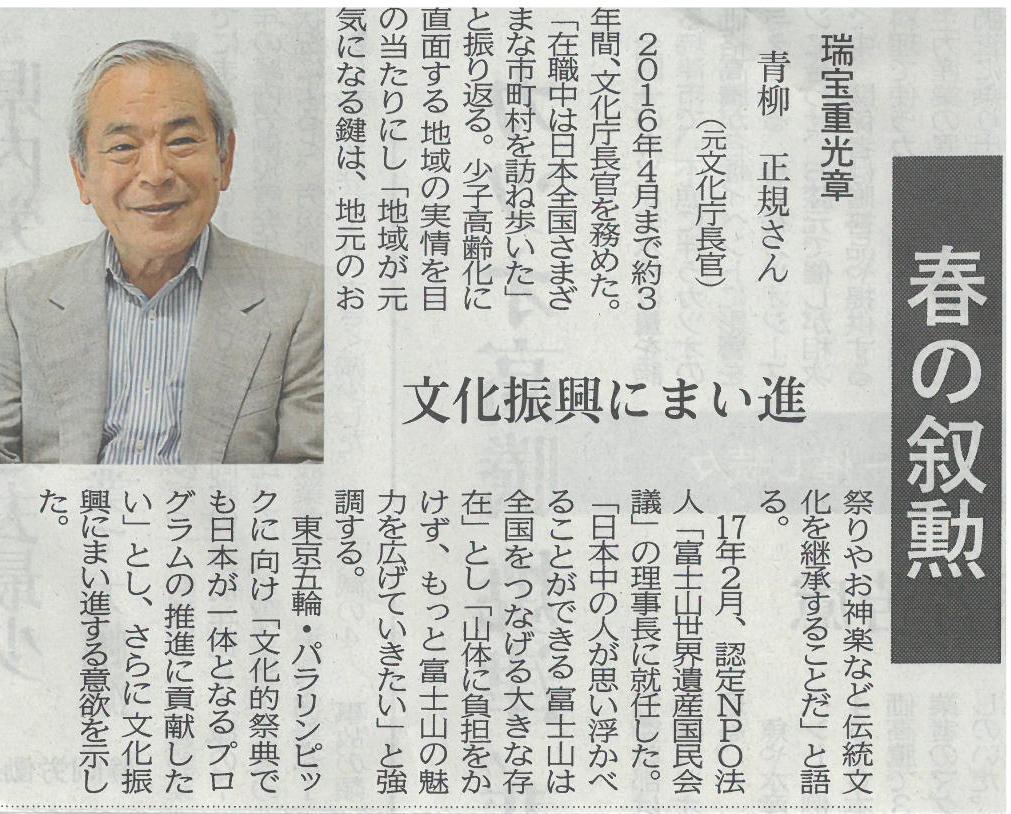 春の叙勲 瑞宝重光章 青柳正規さん(元文化庁長官)富士山世界遺産国民会議理事長2017年5月1日 富士山世界遺産国民会議の青柳理事長が、「山体に負担をかけず、もっと富士山の魅力を広げていきたい。」等の豊富を語りました。 静岡新聞 平成29年4月29日(土)朝刊 春の富士登山 遭難防げ 県警救助隊 須走口でパトロール 春の叙勲 瑞宝重光章 青柳正規さん(元文化庁長官)富士山世界遺産国民会議理事長 富士山巡拝パンフ配布 須走口PR