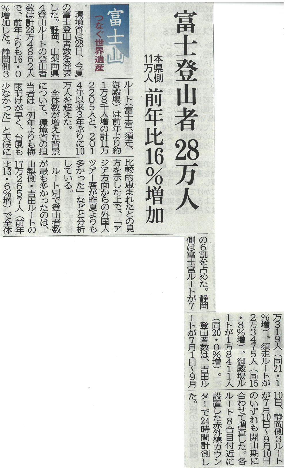 富士登山者大幅増28万人 前年比16%増加2017年10月2日 山梨日日新聞 平成29年9月29日(金) 静岡新聞 平成29年9月29日(金) 朝刊 山梨側 入山料協力率56.9% 前年比7.6ポイント減 富士登山者大幅増28万人 前年比16%増加 霊峰をテーマに書き初め募集