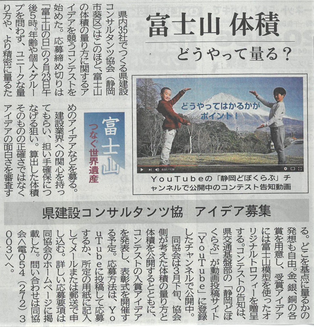 富士山の体積の量り方アイデア募集2018年1月24日 静岡新聞 平成30年1月23日(火) 朝刊 矢部さん最優秀賞、竹下さん富士山世界遺産国民会議賞を受賞 富士山の体積の量り方アイデア募集 日本富士山協会 絶景50選をDVDに