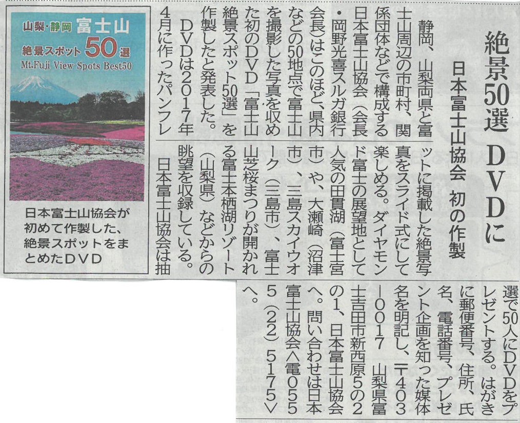 日本富士山協会 絶景50選をDVDに2018年1月24日 静岡新聞 平成30年1月23日(火) 朝刊 富士山の体積の量り方アイデア募集 日本富士山協会 絶景50選をDVDに 静岡富士山世界遺産センター来館者6万人超える