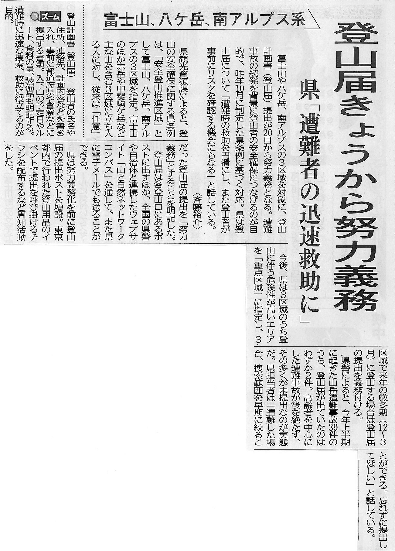 登山届今日から努力義務 ~富士山、八ヶ岳、南アルプス系~2018年10月22日 山梨日日新聞 10月20日 朝刊 富士登山鉄道の検討会設置 登山届今日から努力義務 ~富士山、八ヶ岳、南アルプス系~ 新JASマークに富士山