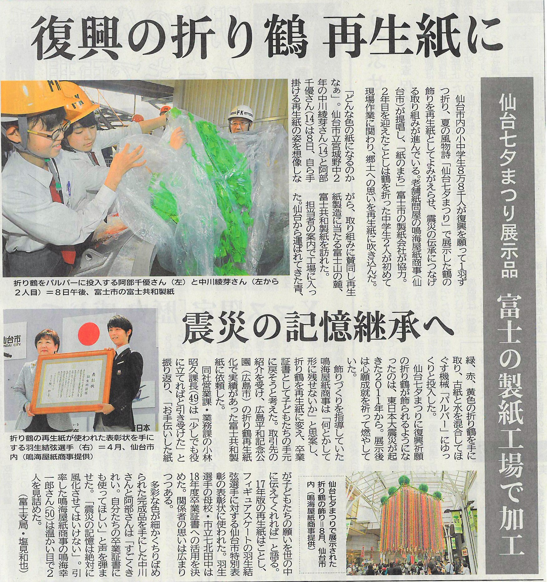 富士の製紙工場 復興の折り鶴再生紙に