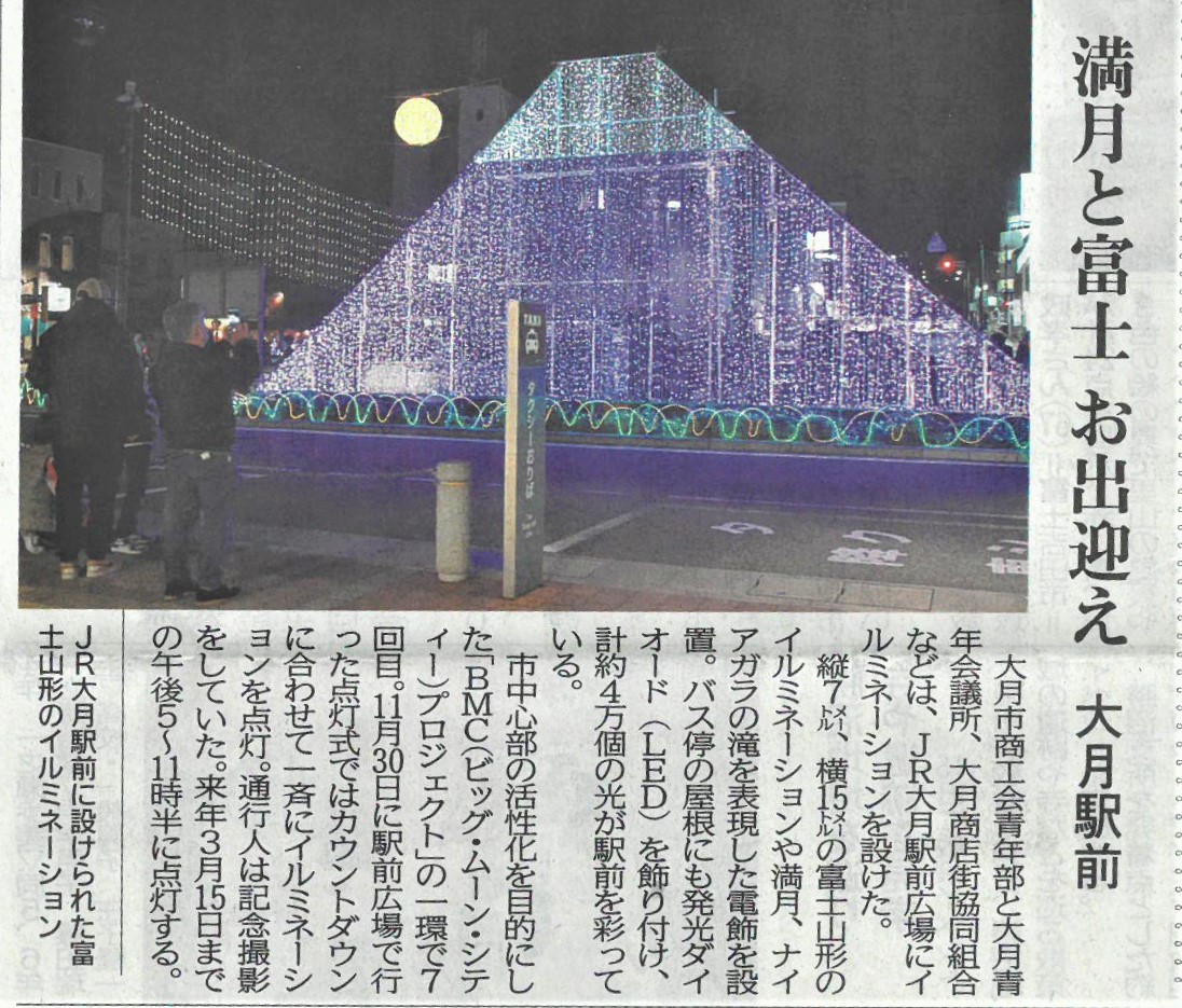 満月と富士イルミネーション 大月駅前2018年12月6日 山梨日日新聞 12月6日 朝刊 富士山遭難備え県警連携 山梨、静岡 満月と富士イルミネーション 大月駅前 「静岡銀行」富士山基金に86万円のご寄付