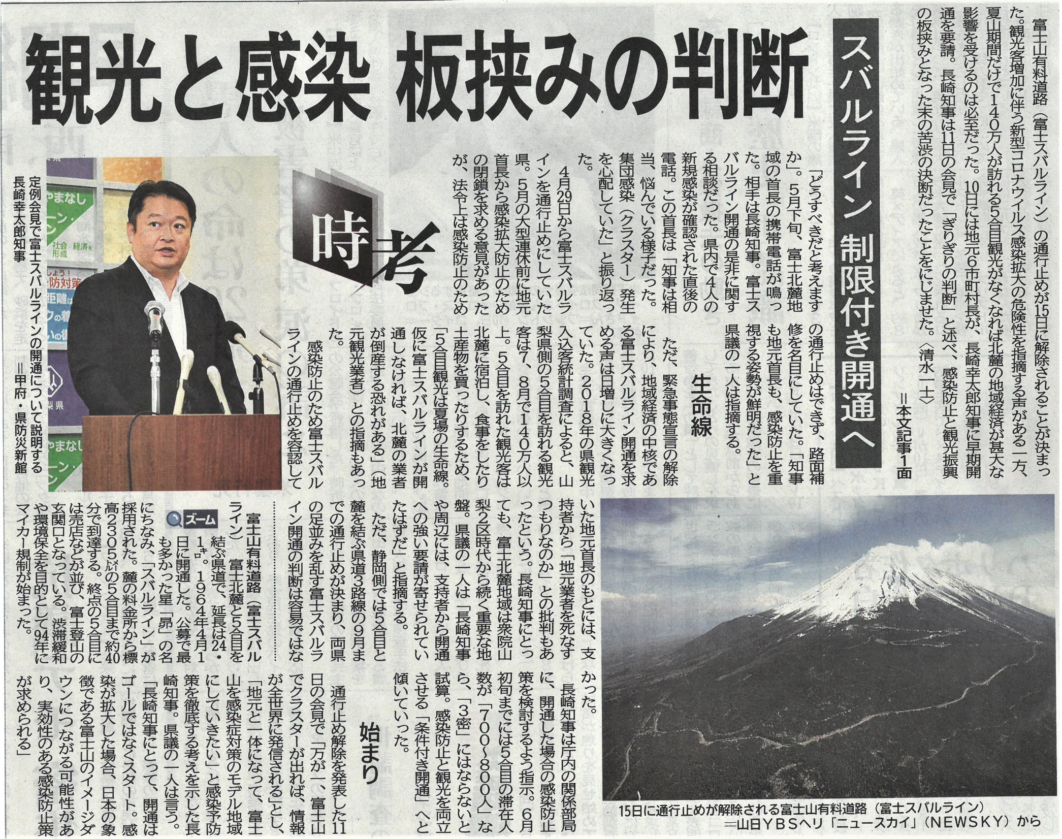スバルライン15日開通 富士山5合目来訪750人まで2020年6月19日 6月12日 山梨日日新聞 富士スバルライン15日開通 登山者の本県側流入懸念 スバルライン15日開通 富士山5合目来訪750人まで 入山料 ふるさと納税で