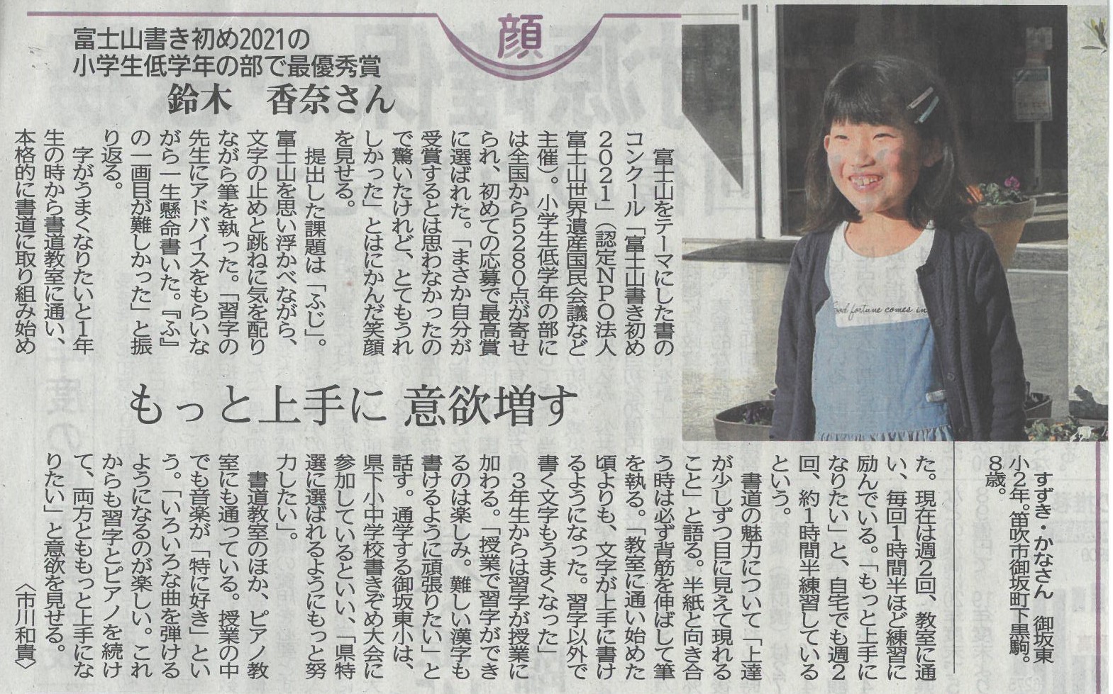 「富士山書き初め2021」山梨県受賞者インタビュー2021年2月12日 2月10日 山梨日日新聞 富士山登山鉄道構想 山梨知事 国PT新設表明 「富士山書き初め2021」山梨県受賞者インタビュー 富士山書き初め2021 入賞作品24点展示