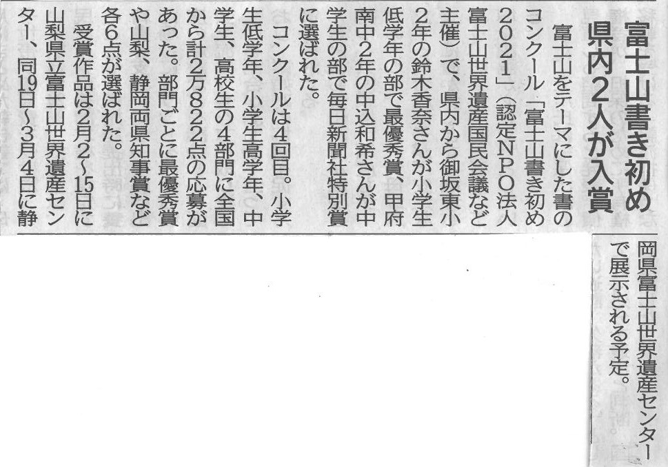富士山書き初め 山梨県内2人が入賞2021年2月8日 1月16日 山梨日日新聞 「富士山書き初め2021」静岡県受賞者インタビュー静岡新聞に掲載 富士山書き初め 山梨県内2人が入賞 富士山鉄道 往復1万円