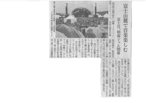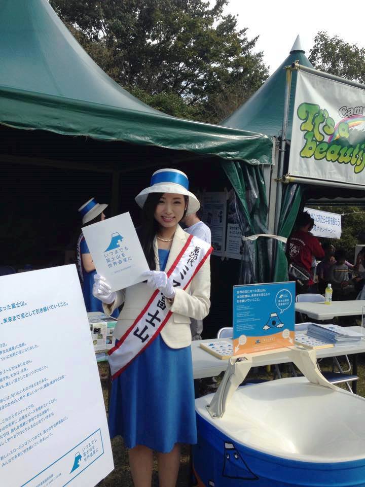 朝霧jamで啓発・募金活動2014年10月14日 10月11日(土)、12日(日)に静岡県富士宮市の朝霧高原で開催された朝霧jam。富嶽三十六音楽祭としてご協力をいただき、両日会場内のブースで、パンフレット、いつまでもシールなどを配布、啓発活動を実施、また、富士山基金への募金活動も実施した。 両日、富士宮の観光のため来場したミス富士山にも、会場を盛り上げていただいた。 新聞記事は静岡新聞 平成26年10月12日朝刊 石見銀山世界遺産センター公開講座2014 朝霧jamで啓発・募金活動 浜名湖競艇様から富士山基金へ寄付