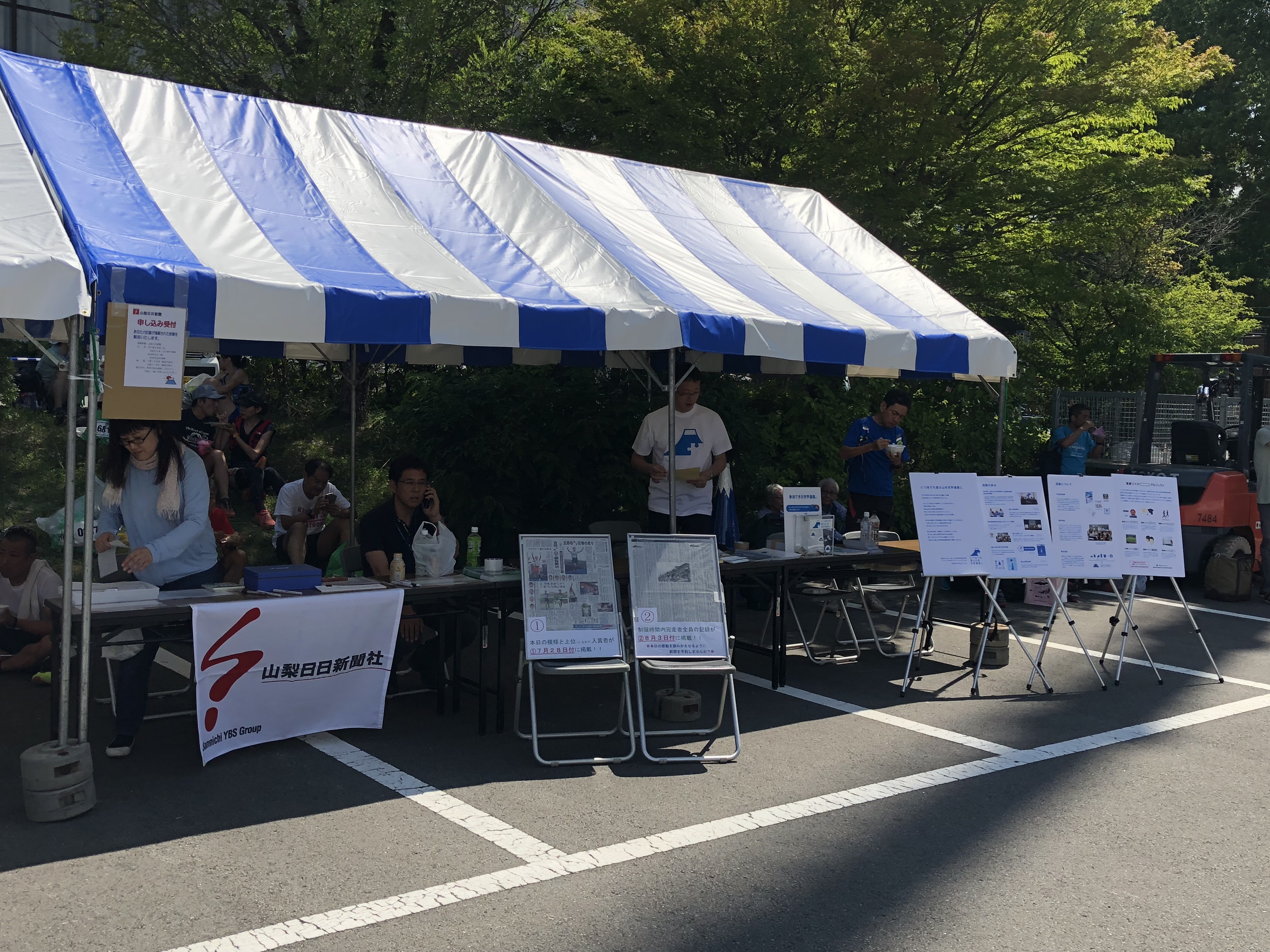 7月27日(金)に山梨県富士吉田市で開催された第71回富士登山競走で富士山会議はPR活動を行いました。富士吉田市役所~吉田口登山道~富士山頂に至る約21キロの山頂コースと、富士吉田市役所~吉田口登山道~5合目に至る約15キロの5合目コースに、全国47都道府県から4000名を超える選手が参加。海外からも10ヵ国50名の選手が集まりました。レースを終えた選手が集まる富士北麓公園の表彰式・閉会式会場の山梨日日新聞社ブースで、富士山会議の活動紹介パネルの展示、ロゴ入りビニールケースの配布、募金活動などを実施しました。