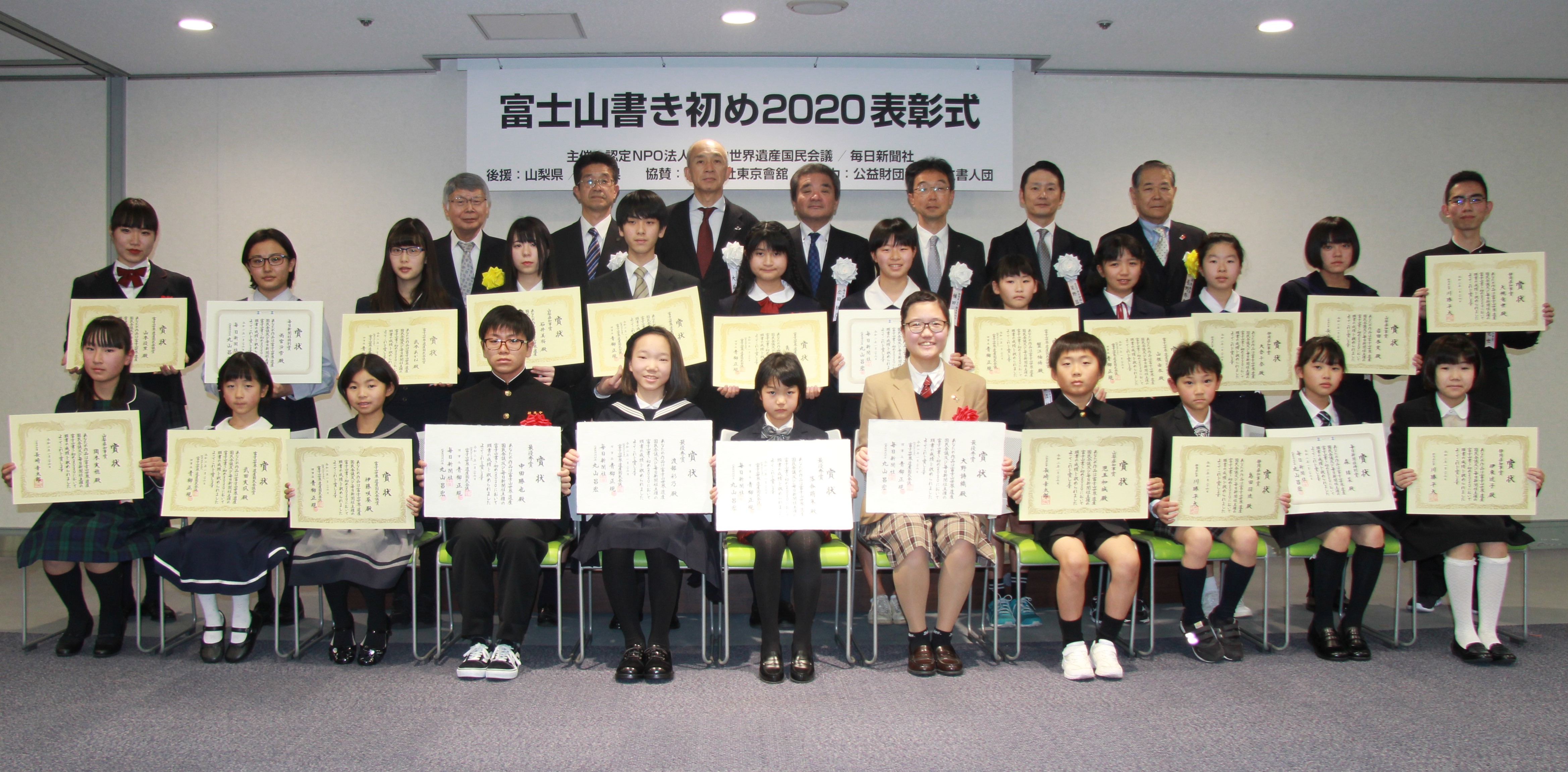 1月26日(日)「富士山書き初め2020表彰式」が、毎日ホールで行われました。主催の富士山会議、毎日新聞社、後援の山梨県・静岡県からの表彰および記念撮影などが行われました。最優秀受賞者のみなさまには、それぞれの富士山への思いを語っていただきました。また、毎日新聞東京本社1階で富士山書き初め2020の受賞作品が、1月29日(水)まで展示されています。素晴らしい作品をぜひご覧ください。 IMG_0011 (002) DSC_2246