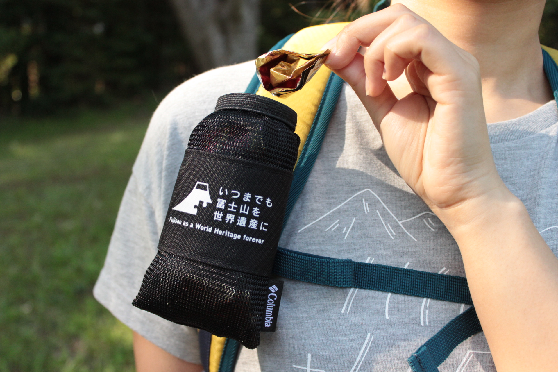 コロンビアが提案する山のマナーアッププロジェクト「アリガト山」とNPO法人富士山世界遺産国民会議・マウントフジトレイルクラブが推進する「ふじさんゼロゴミアクション」がコラボした「アリガト山ゼロゴミポーチ」。バックパックに取り付けることで、登山中にご自身のゴミや拾ったゴミをサッと入れることができます。