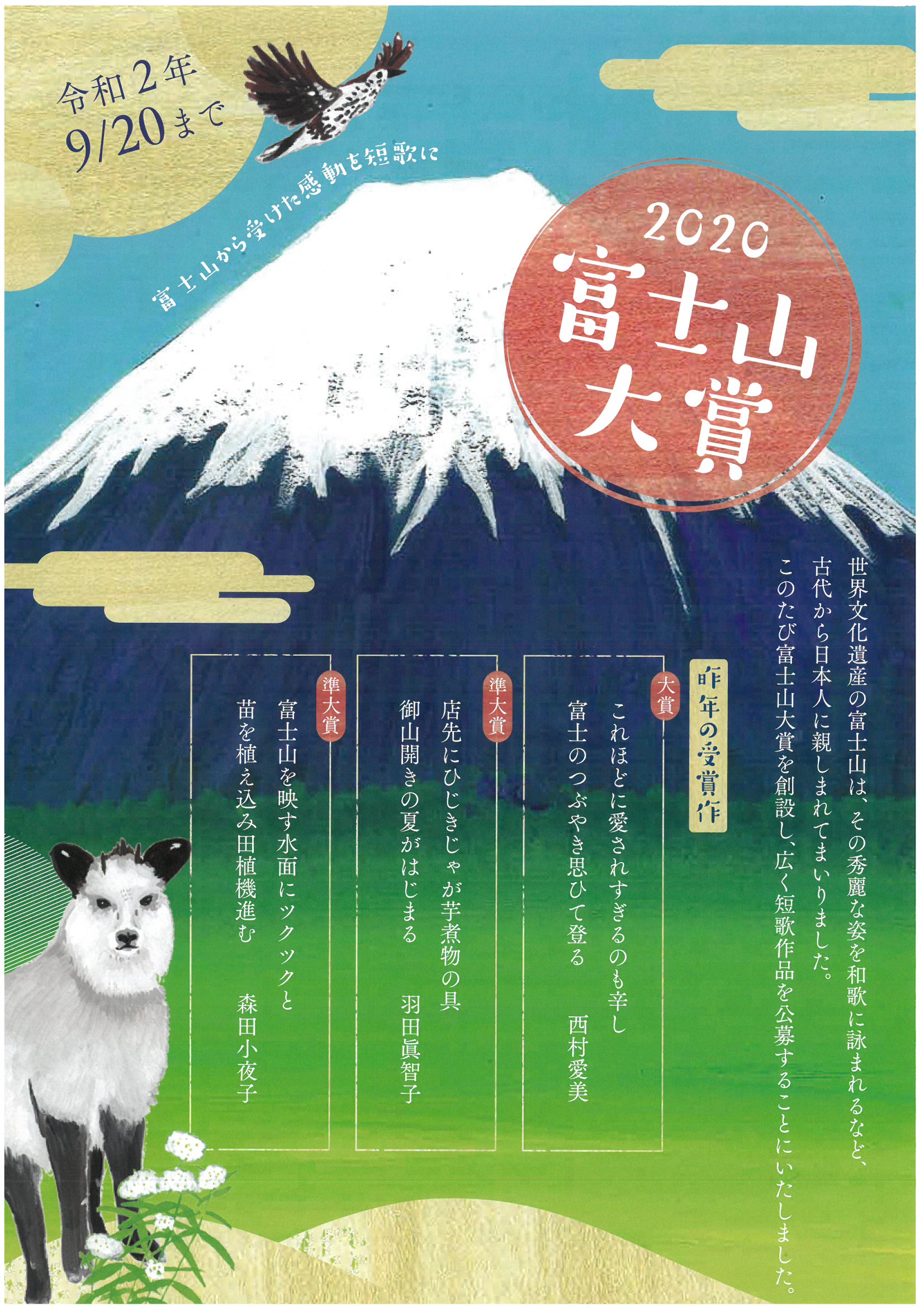 富士山大賞2020は、世界文化遺産富士山を詠んだ短歌のコンクールです。9月20日まで募集しています。今年は富士山には登れませんが、あなたのとっておきの富士山を短歌にしてぜひご応募してみませんか。主催:富士山大賞実行委員会 後援:富士山世界遺産国民会議