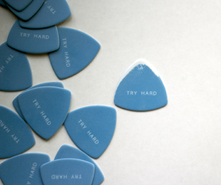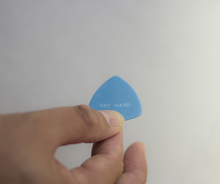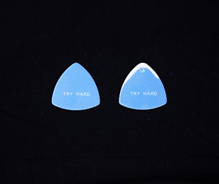 中央にはTRY HARD(一生懸命やろう)と書かれています。ギターを弾く人のクセによって、それぞれの雪を冠った富士山が完成。一途に同じピックを使い倒すタイプの人ならば、ピック本体も削れて、また独特の形となります。